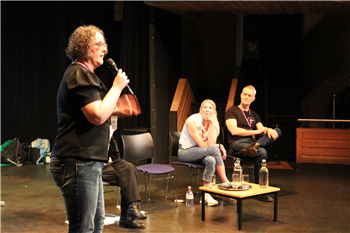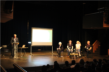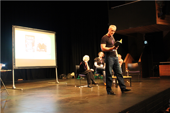 Photo 1: Chris Ashton, Service Manager for Warwickshire Libraries with the shortlisted authors on stage