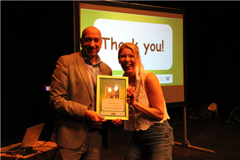 Photo 2: Ayub Khan, Head of Libraries, Heritage & Culture and Registration for Warwickshire with winning author, Jenny Pearson